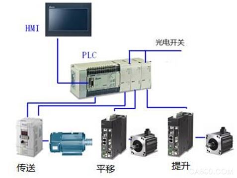 根據龍門磁力碼垛機的作業(yè)流程和客戶應用需求,臺達整合自有人機界面、PLC、變頻器、伺服驅動器和電機等,組成控制解決方案,架構如下: