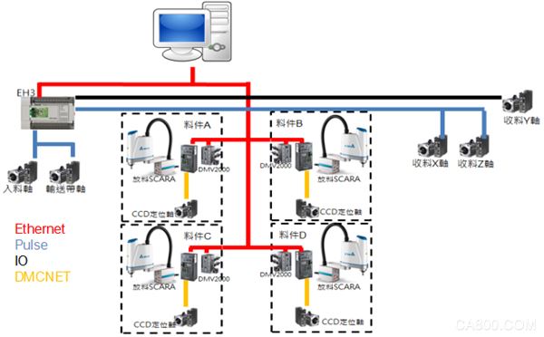 該方案采用高生產(chǎn)適應(yīng)性的流水線架構(gòu),模塊化構(gòu)成,通過(guò)“自動(dòng)化取放料站概念”和“視覺(jué)辨識(shí)”實(shí)現(xiàn)快速換料或擴(kuò)種物料種類(lèi)的動(dòng)作,方便實(shí)用。同時(shí),該方案采取臺(tái)達(dá)DMCNET總線架構(gòu),實(shí)現(xiàn)“分類(lèi)-包裝”整線運(yùn)行,與不同上位架構(gòu)結(jié)合,更具彈性。系統(tǒng)架構(gòu)如圖1所示。