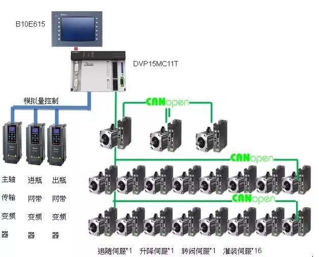 在這一方案中,灌扎線的系統(tǒng)控制全部由臺達多軸運動控制器DVP-15MC系列統(tǒng)一調(diào)配。搭配伺服驅(qū)動系統(tǒng)ASDA-A2系列,進行追隨、升降、轉(zhuǎn)閥、灌裝等。而進瓶網(wǎng)帶、出瓶網(wǎng)帶和傳輸線則由臺達變頻器負責(zé)。