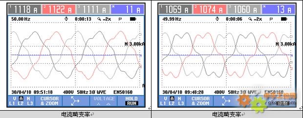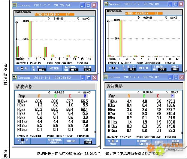 由以上數(shù)據(jù)可以清晰看出投入傳統(tǒng)無功補償裝置前后:配電系統(tǒng)電壓畸變率由4.8%放大到6.5%,超過國標14549-93標準;配電系統(tǒng)電流畸變率由9.5%放大到18.9%,總諧波電流由由112A放大到202A;配電系統(tǒng)電流波形由不規(guī)則單峰變成雙峰,主要放大諧波以5次和11次諧波較為明顯。