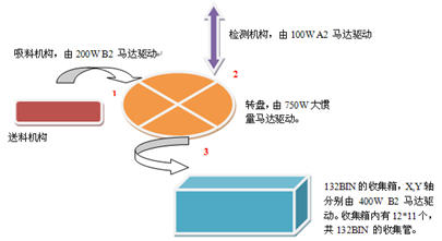 送料機(jī)構(gòu)把料送到固定位→吸料機(jī)構(gòu)把料送到轉(zhuǎn)盤上的工位1→轉(zhuǎn)盤轉(zhuǎn)動(dòng)一個(gè)角度把料送到工位2→檢測(cè)機(jī)構(gòu)下來工作采集相關(guān)數(shù)據(jù)→轉(zhuǎn)盤再把檢測(cè)后的料送到工位3→高壓氣槍把料吹入收集箱(收集箱會(huì)根據(jù)檢測(cè)的結(jié)果,事先確定好收集管的位置)。