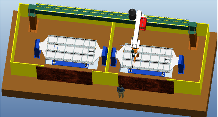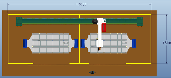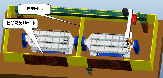 將所有運(yùn)動(dòng)設(shè)計(jì)布置與圍欄內(nèi),可以為工人及其他相關(guān)人員提供一個(gè)安全可靠的工作環(huán)境。圍欄布置有檢修和人工上料門,布置必要的檢測開關(guān),并與整套控制系統(tǒng)聯(lián)動(dòng),在設(shè)備正常工作時(shí),假如有人員闖入,將立即停止所有設(shè)備的運(yùn)轉(zhuǎn),確保人員安全。其分為兩個(gè)獨(dú)立部分,集體結(jié)構(gòu)見下圖。這樣可以將兩個(gè)工位分成獨(dú)立的兩個(gè)工作空間,使得人工裝卸料和焊接分開獨(dú)立運(yùn)行,互不影響。