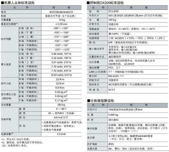 本系統(tǒng)選用MOTOMAN六軸工業(yè)機(jī)器人,荷重10kg,工作半徑R2010mm,包括機(jī)器人本體、機(jī)器人控制柜、示教盒、變壓器及供電電纜等。