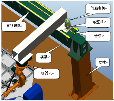 外部移動(dòng)軸為機(jī)器行走機(jī)構(gòu),實(shí)現(xiàn)不同工位弧焊機(jī)器人的位置變換、同時(shí)在長度方向上適應(yīng)工件的焊接范圍。此機(jī)構(gòu)采用伺服電機(jī)驅(qū)動(dòng),齒輪齒條傳動(dòng),直線導(dǎo)軌導(dǎo)向,機(jī)架采用桁架結(jié)構(gòu),其采用型鋼焊接,分段制造、整體組裝。具體結(jié)構(gòu)見下圖。