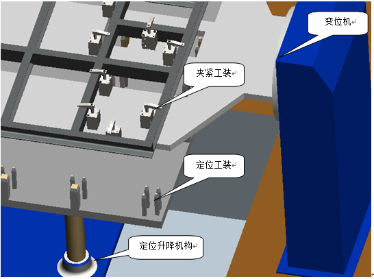 ? 夾緊工裝:主要由機(jī)架和夾緊氣缸構(gòu)成,機(jī)架同夾緊氣缸連接為一個(gè)整體,并安裝于變位機(jī)構(gòu)上。主要功能實(shí)現(xiàn)機(jī)架散件的夾緊和機(jī)架焊接成整體后的夾緊,同時(shí)兼顧機(jī)架和散件的定位功能。
