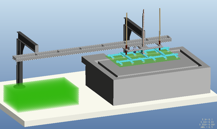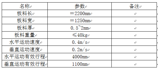 甲方目前使用人工搬運方式,將所需切割板料搬運到激光數(shù)控切割機(jī)。此搬運方式需要至少兩個人配合,且勞動強(qiáng)度大。為了解決目前情況,我公司專門設(shè)計自動物料搬運設(shè)備,此設(shè)備只需一人操作,通過按鈕手動控制抓取物料后即可自動上料并返回取料位置。