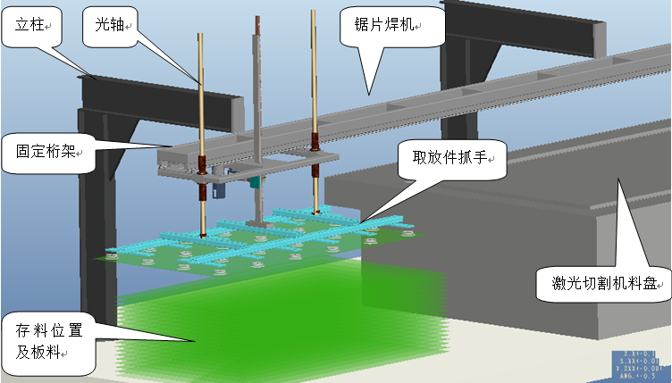此系統(tǒng)為實現(xiàn)激光切割機(jī)焊機(jī)的半自動上下料而特別設(shè)計的。本系統(tǒng)由垂直提升系統(tǒng)和水平運動系統(tǒng)及取放件系統(tǒng)等構(gòu)成;配套自動化控制系統(tǒng)和智能界面,實現(xiàn)人工手動控制取件,完成板料自動搬運、自動放料、自動歸位的自動化上下料過程。