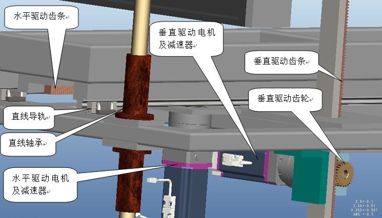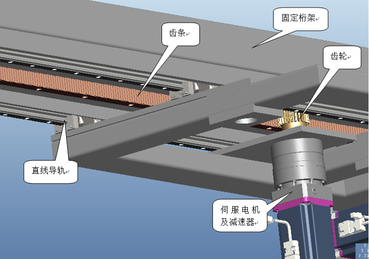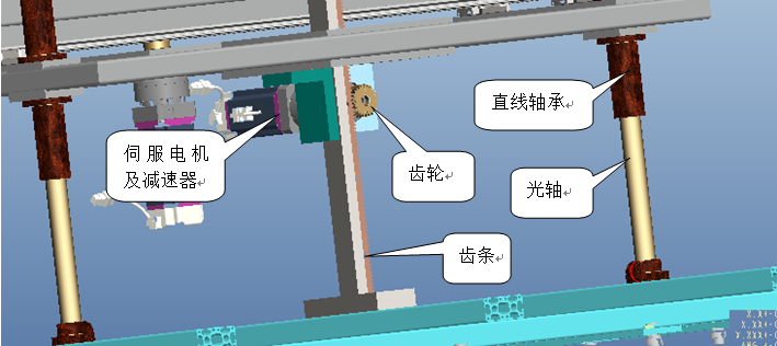 傳動系統(tǒng)采用齒輪齒條傳動,并配置臺達(dá)伺服電機(jī)及新寶減速器。齒輪齒條運動平穩(wěn)可靠,并且性價比極高,此設(shè)計可以有效減輕甲方的采購成品。