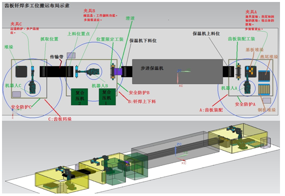 通過機器人A攜三功能夾具、配合“裝配工裝”實現(xiàn)對基板、銅板和燕尾的分別抓取及定位組合,完成組合的齒板由機器人將其從“裝配工裝”上搬運至“步進保溫機的上料口”。