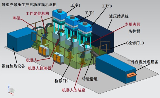 按照以上思路、鐘型殼鍛壓生產(chǎn)線將實現(xiàn)通過機器人替換人力,使生產(chǎn)線的人力勞動強度極大降低、綜合生產(chǎn)效率得到提高,實現(xiàn)鍛壓生產(chǎn)線的自動化。