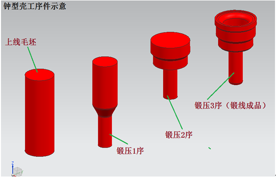 該鐘型殼零件通過熱軋完成、需要保證鍛壓作業(yè)時零件的溫度,因此需要注意轉(zhuǎn)運環(huán)節(jié)節(jié)拍的控制、以減少溫度的損失。末鍛(3序)的零件溫度需大于580度。