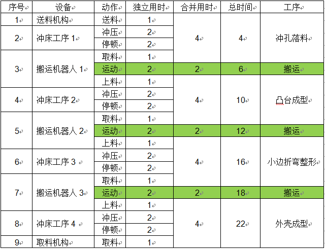 1) 由于表可以看出單件生產(chǎn)的出料總耗時為22s。