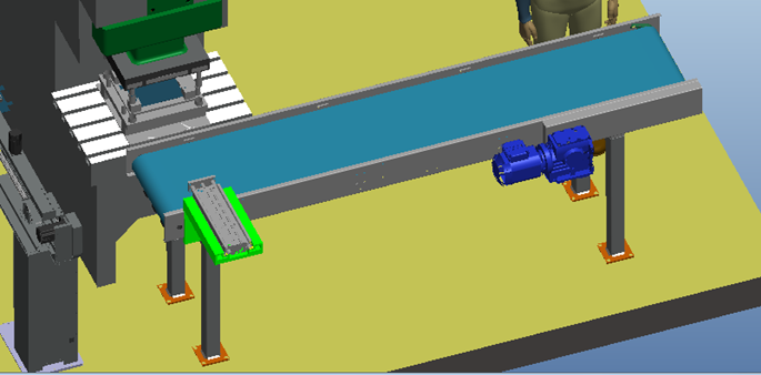 10) 出料輸送線的的取料機構(gòu)將成型好的外殼從外外殼成型工位取出并放到輸送線上,由輸送線將外殼傳送到遠離沖床位置,方便人工碼放。