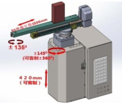 J3軸:伸縮;標準機活動半徑1250MM,有效行程可做到500MM;