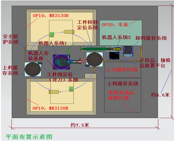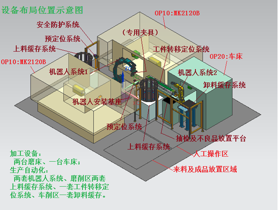 該自動(dòng)生產(chǎn)線由OP10磨床2臺(tái)、OP20車(chē)床1臺(tái)、機(jī)器人系統(tǒng)2套(含夾具及基座)、磨床上料緩存系統(tǒng)2套(含預(yù)定位對(duì)刀系統(tǒng))、工件轉(zhuǎn)移定位系統(tǒng)1套(含抽檢及放置平臺(tái))、OP20卸料緩存裝置1套、安全防護(hù)系統(tǒng)和電器控制(本方案中未作示意)系統(tǒng)組成。