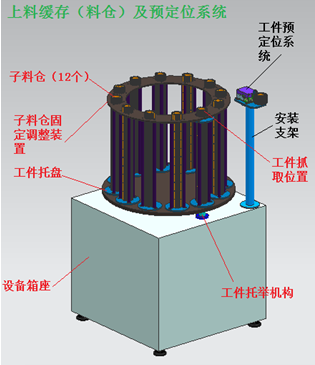 主要由具備分度轉(zhuǎn)位的工件托盤(pán)、工件托舉機(jī)構(gòu)、12個(gè)子料倉(cāng)和設(shè)備箱座及電器控制等部分構(gòu)成。