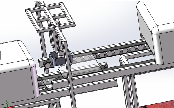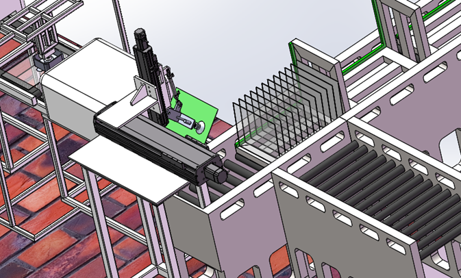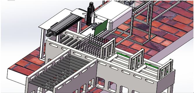 四軸上料機(jī)器人負(fù)載將堆放好毛玻璃通過X軸、Y軸、Z軸和R軸搬運(yùn)到寬邊磨邊機(jī)的傳送鏈上,由磨邊機(jī)進(jìn)行位置調(diào)整,調(diào)整完成后進(jìn)入寬邊加工件,對(duì)毛玻璃的4個(gè)面進(jìn)行加工。X軸集成在上料滾筒輸送鏈上,實(shí)現(xiàn)料倉(cāng)的自動(dòng)進(jìn)給和無(wú)間歇式換料。