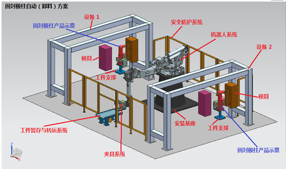 該方案屬于客戶生產(chǎn)線的技術(shù)改造方案,以提高作業(yè)效率、降低工人勞動強(qiáng)度、預(yù)防作業(yè)安全為基本目的。整個系統(tǒng)包括:機(jī)器人系統(tǒng)、夾具系統(tǒng)、安全防護(hù)系統(tǒng)、工件暫存與轉(zhuǎn)運(yùn)系統(tǒng)、電器控制系統(tǒng)及安裝基座等構(gòu)成。