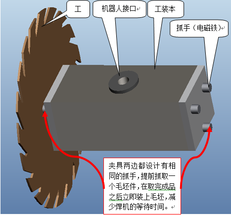 取放件夾具的設(shè)計原則是滿足抓取功能的同時縮短鋸片焊機的等待時間,故在夾具兩邊都設(shè)計有相同的抓手,以便在取完成品后立即裝上毛坯件。