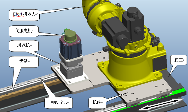 機器人七軸為機器行走機構(gòu),實現(xiàn)不同工位焊機之間的來回運轉(zhuǎn)。此機構(gòu)采用伺服電機驅(qū)動,齒輪齒條傳動,直線導(dǎo)軌導(dǎo)向,底座采用型鋼焊接,分段制造、整體組裝。設(shè)計運動速度42m/min。具體結(jié)構(gòu)見下圖。