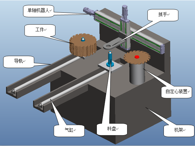 ? 自定心裝置的設(shè)計是為了給取放件機器人一準(zhǔn)確位置,方便在抓取之后準(zhǔn)確將工件裝載鋸片焊機上。