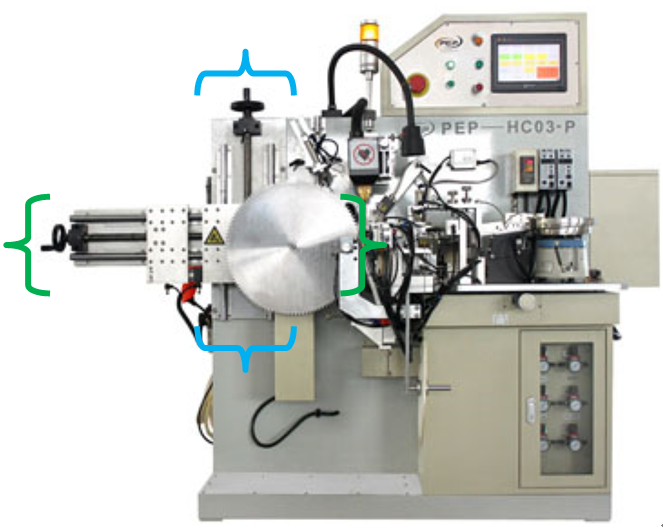 為了取放工件時機器人有足夠的空間活動,避免與鋸片焊機的干涉,需要對焊機上裝載工件的兩個活動軸進行自動化改造(下圖括號標(biāo)記區(qū)域)。