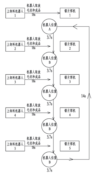 因為每臺焊機都有一個上卸料機器人,故只需要在焊機焊接時間2分鐘內(nèi)完成即可。具體節(jié)拍如下: