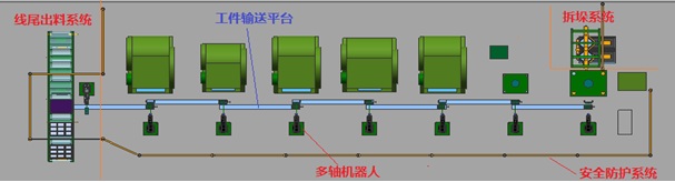 方案示意圖中物料的流向?yàn)閺挠抑磷螅从覀?cè)板料上線、經(jīng)自動(dòng)拆垛后上線加工、左側(cè)為線尾出料部分。