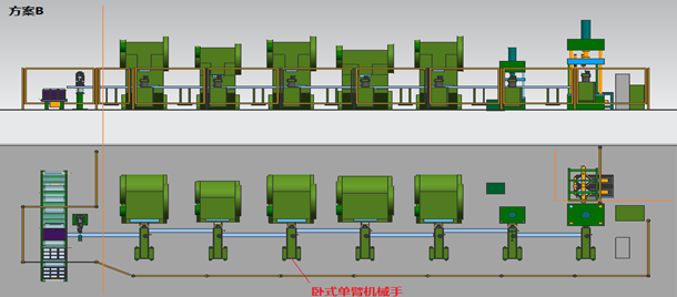 方案B:壓機(jī)上下料使用臥式單臂機(jī)械手。