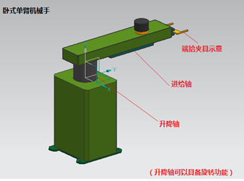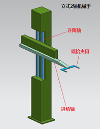 該立式機(jī)械手結(jié)構(gòu)簡(jiǎn)單主要由升降軸和進(jìn)給軸兩部分組成,配合端拾夾具組合后實(shí)現(xiàn)上下料動(dòng)作。