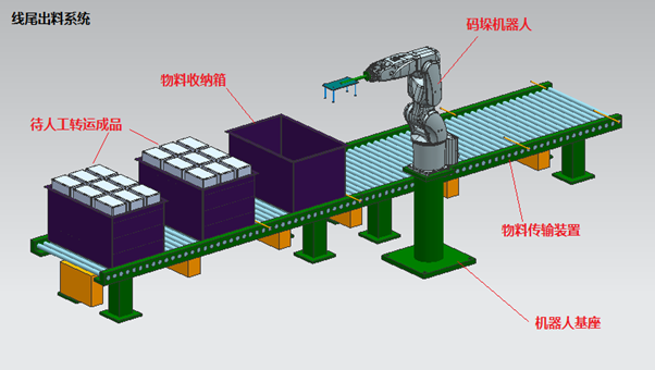 該系統(tǒng)示意參見(jiàn)下圖、主要由物料(收納箱)傳輸裝置、碼垛機(jī)器人系統(tǒng)、檢驗(yàn)平臺(tái)(圖中未示意)、物料收納箱構(gòu)成。