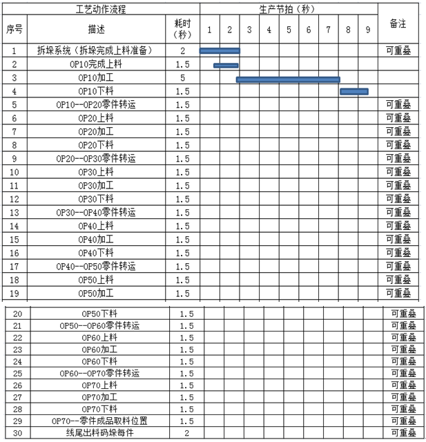 受制于OP10工序、其余各工序在加工時(shí)會(huì)不同程度的出現(xiàn)等待的情況、當(dāng)然可以通過(guò)調(diào)整速度的方式對(duì)整過(guò)生產(chǎn)線的生產(chǎn)做均衡處理。