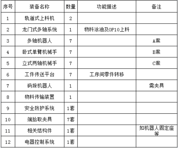 本方案中自動(dòng)化傳輸系統(tǒng)包括為壓機(jī)上下料的裝備(根據(jù)該裝備的不同對(duì)方案給予細(xì)分)和工件傳送設(shè)備兩部分。