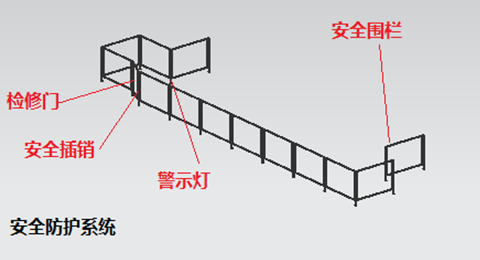 安全是開(kāi)展生產(chǎn)活動(dòng)的大前提、安全防護(hù)系統(tǒng)在自動(dòng)化生產(chǎn)線中又顯的特別重要。該系統(tǒng)主要由完全圍欄、安全插銷、檢修門和警示燈等構(gòu)成。安全圍欄的范圍要考量到裝備的檢修和執(zhí)行端更換等空間位置。
