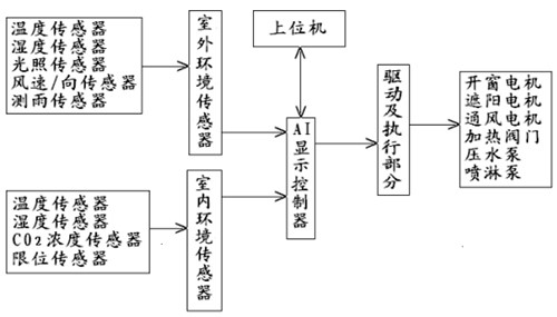 AI總線系統(tǒng)對蔬菜大棚作物生長的主要環(huán)境參數(shù)如溫度、濕度、光照、通風(fēng)進行測控,實現(xiàn)在線閉環(huán)調(diào)節(jié)。實現(xiàn)對蔬菜的生長環(huán)境、技術(shù)管理、生產(chǎn)管理優(yōu)化的科學(xué)決策。系統(tǒng)結(jié)構(gòu)如圖1所示。