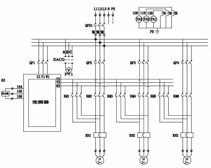 那么變頻器如何實(shí)現(xiàn)一拖多的功能?下面僅僅對一次電氣原理圖做出示例。二次電氣原理圖需要根據(jù)控制要求設(shè)計(jì),此處暫不贅述。