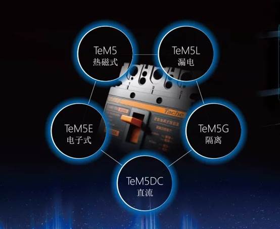 重磅發(fā)布的全新TeM5塑殼斷路器,擁有齊全的熱磁式,漏電,電子式,直流,隔離五大系列產(chǎn)品。此外,該系列還增加特殊功能用途產(chǎn)品:如過載報警不脫扣斷路器、A型漏電斷路器等。