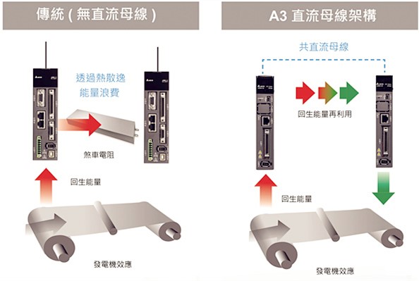 多軸共直流母線設(shè)計,保持直流母線電壓穩(wěn)定,回生能量再利用,機(jī)械設(shè)備更節(jié)能