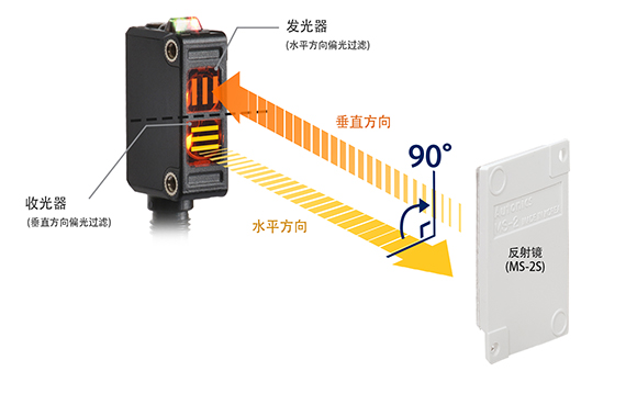 檢測(cè)物反射的光線將保持水平,因此不會(huì)被具有垂直偏振濾光片的收光器接收,可避免檢測(cè)誤動(dòng)作。