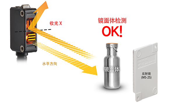 鏡面反射型具有M.S.R. (鏡面抑制)功能,使得傳感器只接收來(lái)自特定反射鏡(MS-2S)的光線。 該功能可以穩(wěn)定檢測(cè)高反射目標(biāo),包括金屬,鏡子等。