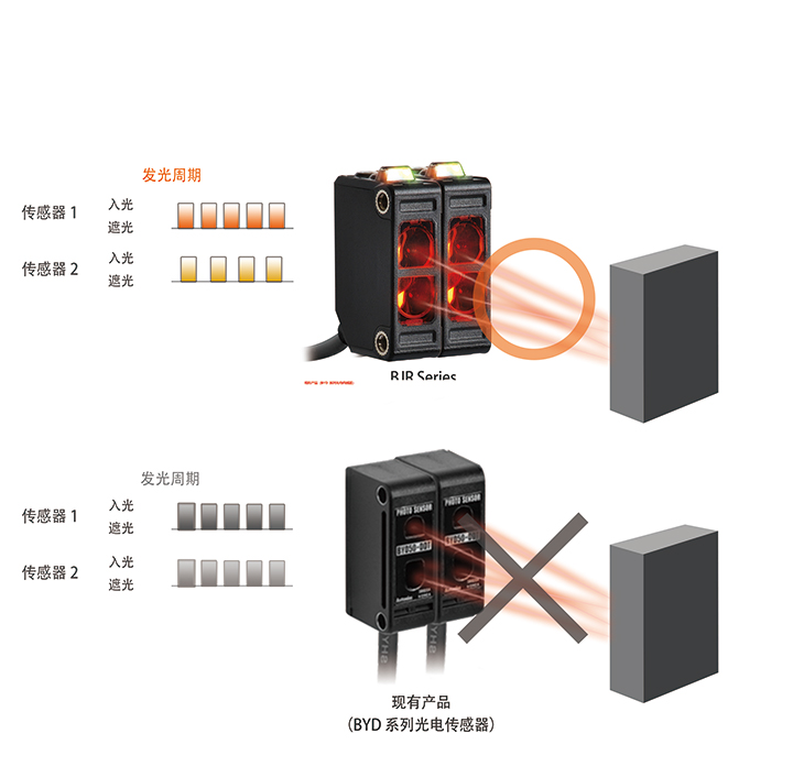 通過(guò)改變傳感器的發(fā)光周期,相鄰傳感器之間互不影響,可以并排緊密安裝。
